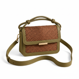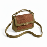 Fabricado en cuero 100% legítimo verde oliva, destaca por su tapa frontal elaborada en tejido artesanal marrón que aporta textura y originalidad. Los herrajes metálicos en tono dorado añaden un acabado sofisticado.