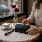 Incluye una correa de muñeca desmontable, lo que permite llevarlo como clutch o como minibolso. Su tamaño compacto y práctico es ideal para guardar lo esencial con estilo.