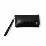 Fabricado en cuero legítimo negro de alta calidad, incorpora herrajes metálicos dorados y un cierre magnético de seguridad. Su textura tipo pitón le da un carácter único y distinguido.