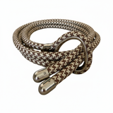 Fabricado con fibras trenzadas de alta resistencia en tonos beige y marrón, incorpora puntas metálicas y herrajes en acero de acabado pulido que garantizan calidad y larga vida útil.