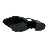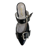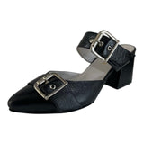 - Diseño: Mule destalonado, punta fina/almendrada, tira ancha con gran hebilla metálica plateada en el empeine, tacón de bloque bajo.