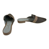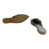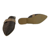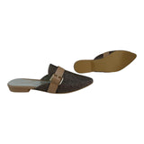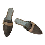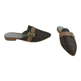 - Diseño: Estilo mule destalonado, punta fina, capellada con patrón de espiga, correa transversal en cuero con hebilla metálica.