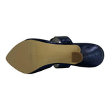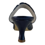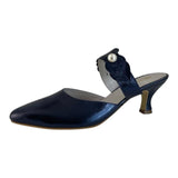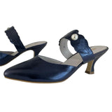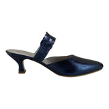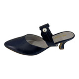 - Diseño: Zapato tipo mule/slingback, punta fina, adorno en forma de hoja con perla en el empeine, tacón estilo carrete.