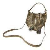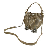 Añade un toque de lujo y sofisticación a tus esenciales con nuestro Bolso 'Mini Oro' de Byjennga. Confeccionado en cuero legítimo de un radiante tono dorado con una distintiva textura granulada, este mini-bolso tipo saco es perfecto para llevar lo indispensable con estilo. Su cierre de cordón ajustable, sus herrajes dorados y sus **encantadoras borlas decorativas** complementan su diseño exclusivo, ideal para la mujer que busca un accesorio chic y funcional para eventos especiales, salidas nocturnas o para añadir un toque de glamour a su look diario.