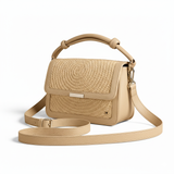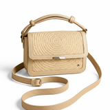 Elaborado en cuero 100% legítimo en tono beige, con una tapa frontal de tejido circular artesanal que lo hace único y sofisticado. Su interior forrado y resistente mantiene tus pertenencias seguras, mientras que los acabados metálicos en tono plateado le aportan un toque moderno.