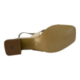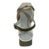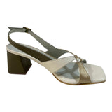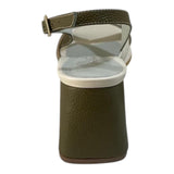 • Diseño: Sandalia de tacón bloque, punta cuadrada, tiras frontales entrelazadas en blanco y dorado/bronce, correa ajustable al tobillo y tacón en verde oliva/militar.